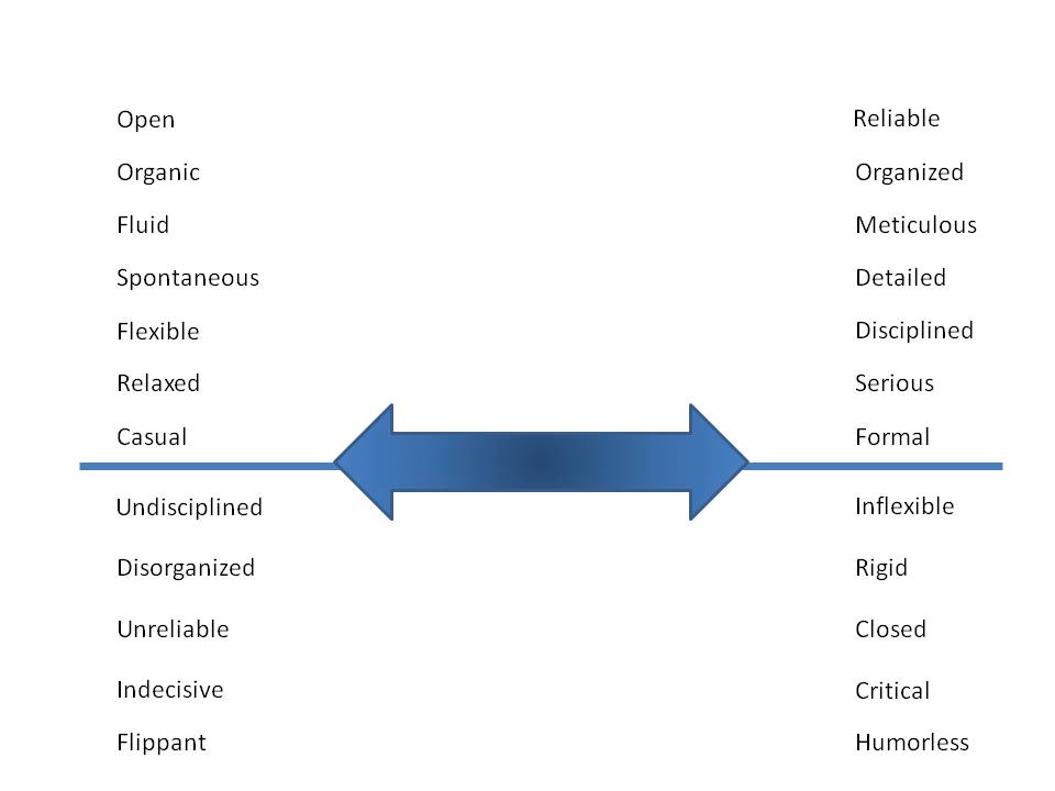 We came up with this scale to describe extremes that we might fall between as project managers. There’s more to be thought through here, but the point is our level of trust might shift depending, not on empirical observation, but rather how we emotionally relate to a colleague, based on where we ourselves fall on the scale below, and where they fall. We may trust them less if they are not closer to our own spot on this scale. Again, not a perfect scale, needs refinement, or probably should use Myers-Briggs instead, but here we go, just as a starting point: